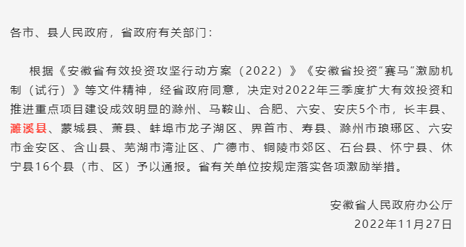 2023年1月10日,安徽省政府网发布《安徽省人民政府办公厅关于2022年三季度全省投资“赛马”激励地区的通报》,经省政府同意,决定对5个市和16个县(市、区)予以通报。其中,濉溪县上榜!
