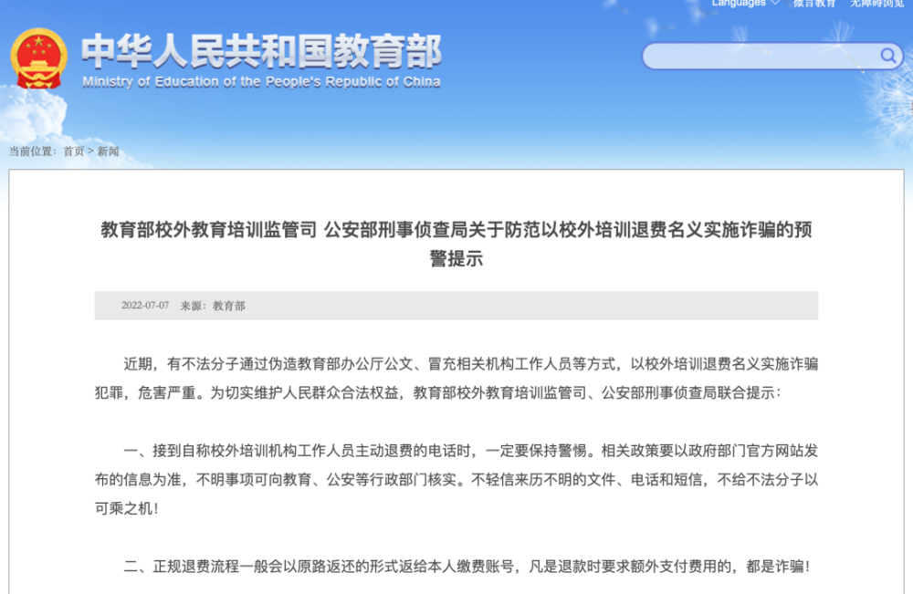 3. 教育部、公安部发布预警提示:防范以校外培训退费名义实施诈骗;