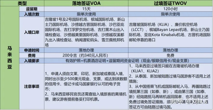 马来西亚入境签证包含过境签TWOV (Transit Without Visa)、落地签VOA (Visa on Arrival)、普通贴纸签、电子签eVISA以及入境凭证函eNTRI五种。
