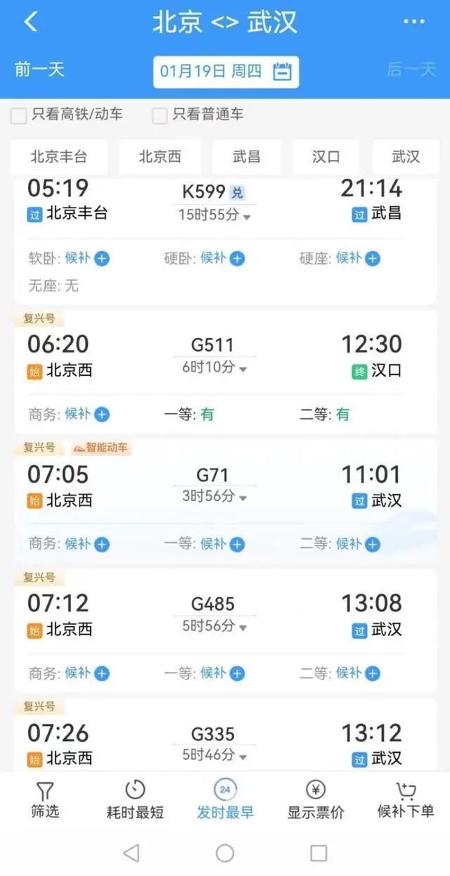 根据售票情况来看,节前,珠三角、长三角地区向中部地区和西南部地区运力比较紧张,1月7日早上8时除夕火车票刚一开售,北京去往武汉、长沙、阜阳、西安、太原、岳阳方向的火车票,大部分列车已经显示为“候补”状态。