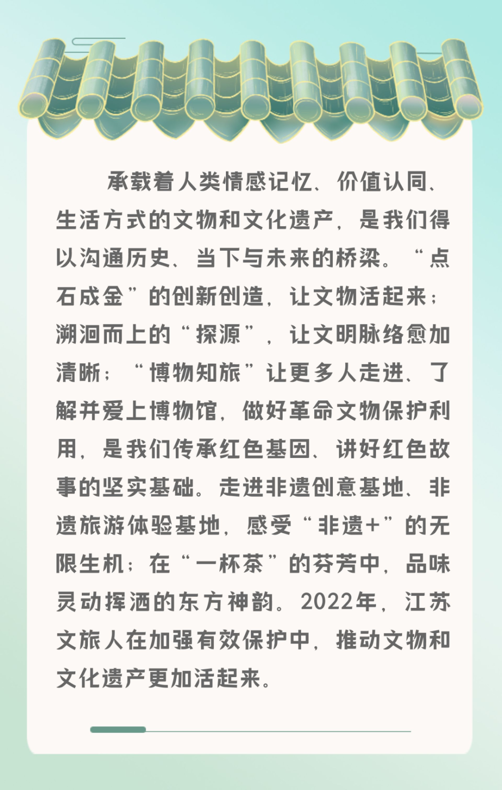 在全国率先出台《关于让文物活起来、扩大中华文化国际影响力江苏行动方案》,研究制定关于加强非遗保护工作、推进博物馆改革发展、传统工艺高质量传承发展等系列政策文件,省委编委批复同意设立江苏省文物考古研究院、在厅机关增设考古管理处。