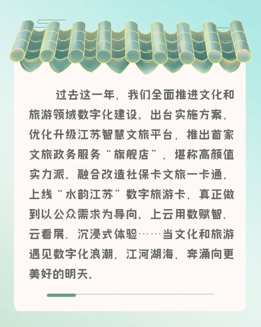 在全国率先打造数字旅游卡产品,首发“水韵江苏”数字旅游卡,初步实现“一卡在手,畅游江苏”。