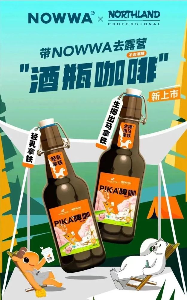 近日,「NOWWA」咖啡联名「NORTHLAND」推出露营“酒瓶咖啡”,包括轻乳拿铁、生椰出马两款不含酒精的产品。同时,NOWWA咖啡 x NORTHLAND 露营体验店在成都大源国际限时开放,线上在小红书同步推出“酒瓶咖啡”返图有礼活动。