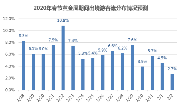 与国内游相比,春节黄金周期间的出境游出发时间相对集中在春节之前,尤以1月22日出发的客流量占比最大,占比10.8%,其次是1月18日(农历腊月24),占比8.3%。春节黄金周期间出境游的出游时长一般在5日以上,这意味着相当一部分的出境游人群选择了在境外的目的地过年。