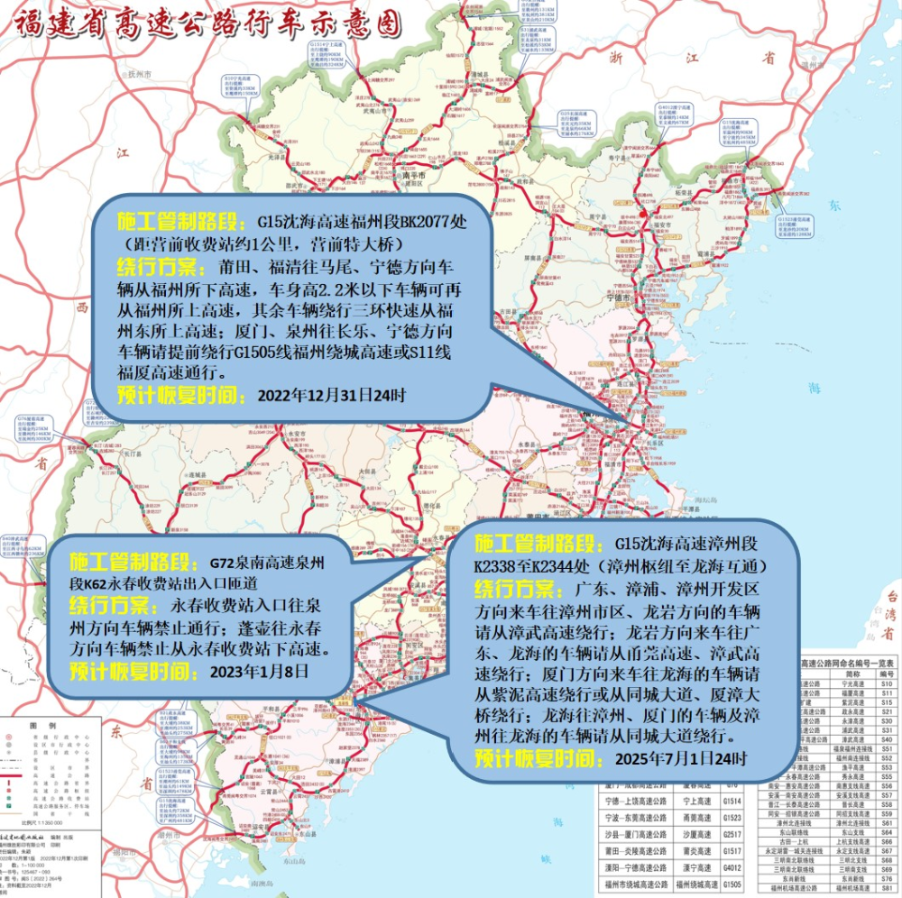 节假日期间,高速公路原则上不进行涉及占用行车道的养护施工作业,但仍有3处正在进行且无法恢复的施工和管制路段,具体地点以及绕行方案详见上图▲