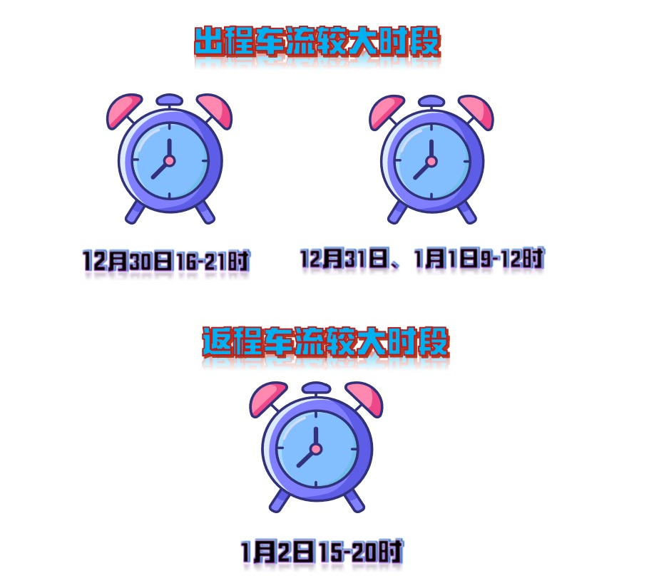 2.2022年12月31日、2023年1月1日9-12时:部分路段及景区周边收费站可能会出现间歇性车流集中;