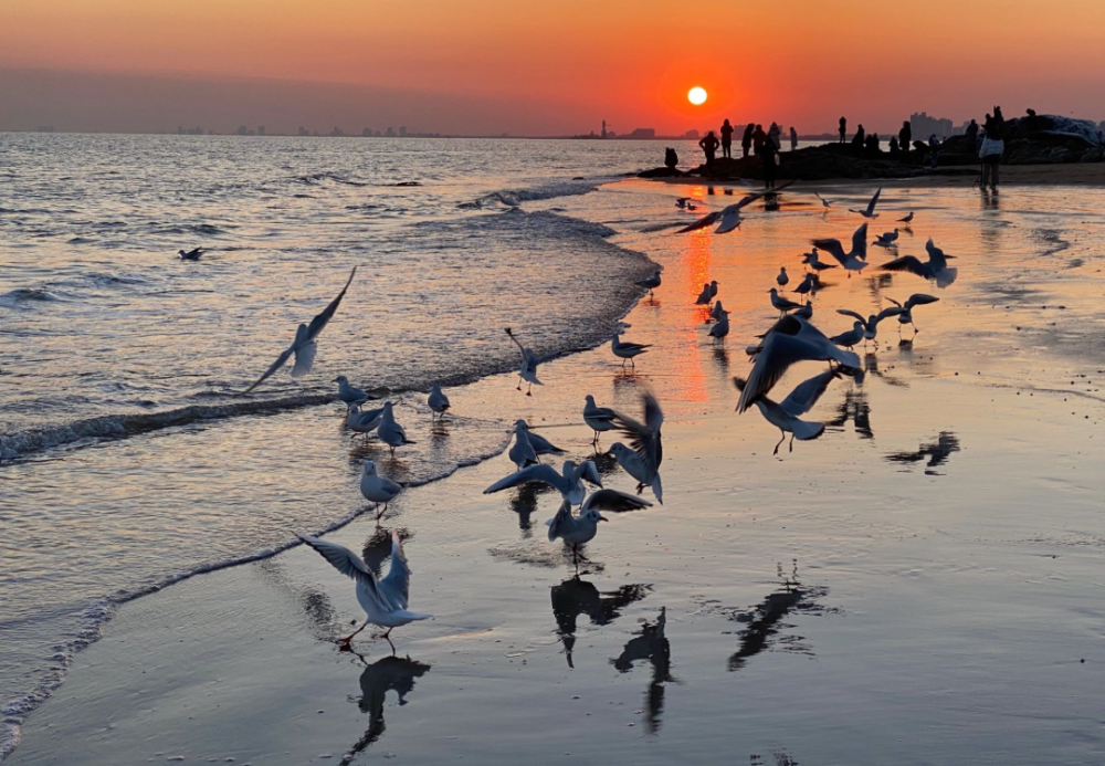 成群结队的海鸥在沙滩上觅食、嬉戏,