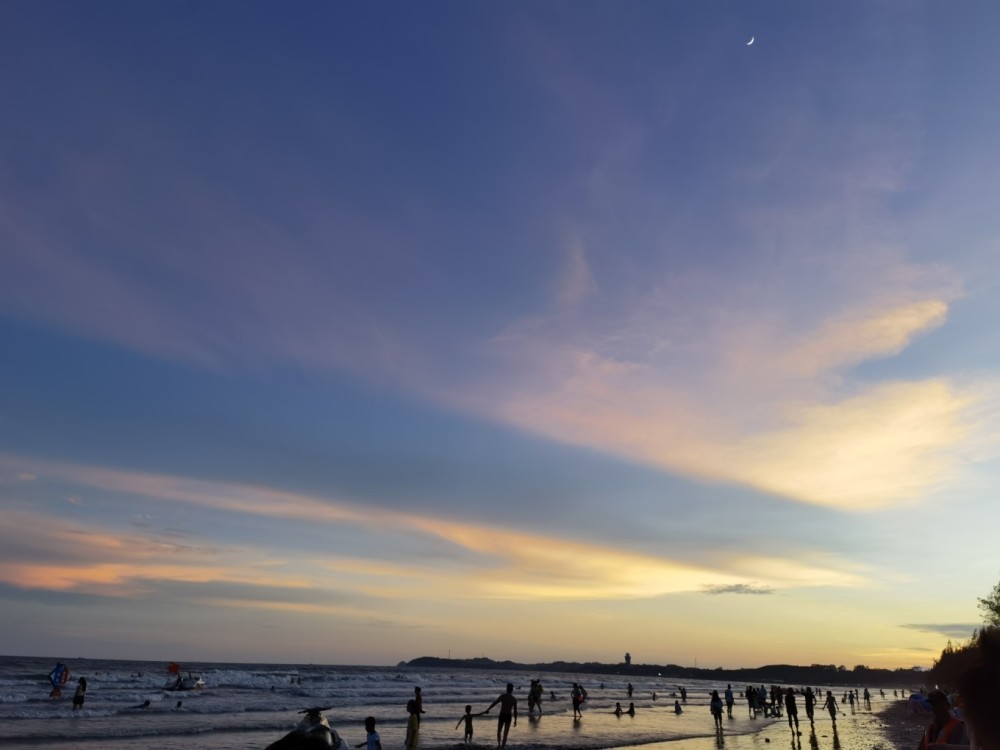 18:00回石螺口海滩戏水,拍日落,第一次拍到粉色的天空。
