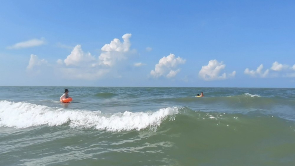 7点左右起床,还是李记猪脚粉,姑姑姑丈陪同,继续银滩游泳。银滩浪比较大,要圈式游泳圈,娃娃才不得被浪冲翻。这里放一张海浪打到镜头上的视频截图哈。