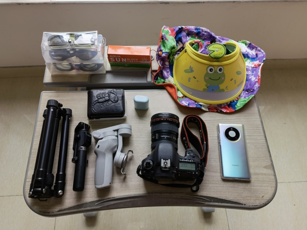 9)自拍杆、三角架(mate10pro日出日落拍延时视频,mate40pro拍相片,彻记要带上充电宝,Gopro没带,单反不建议,大疆云台不防水也没用上)。