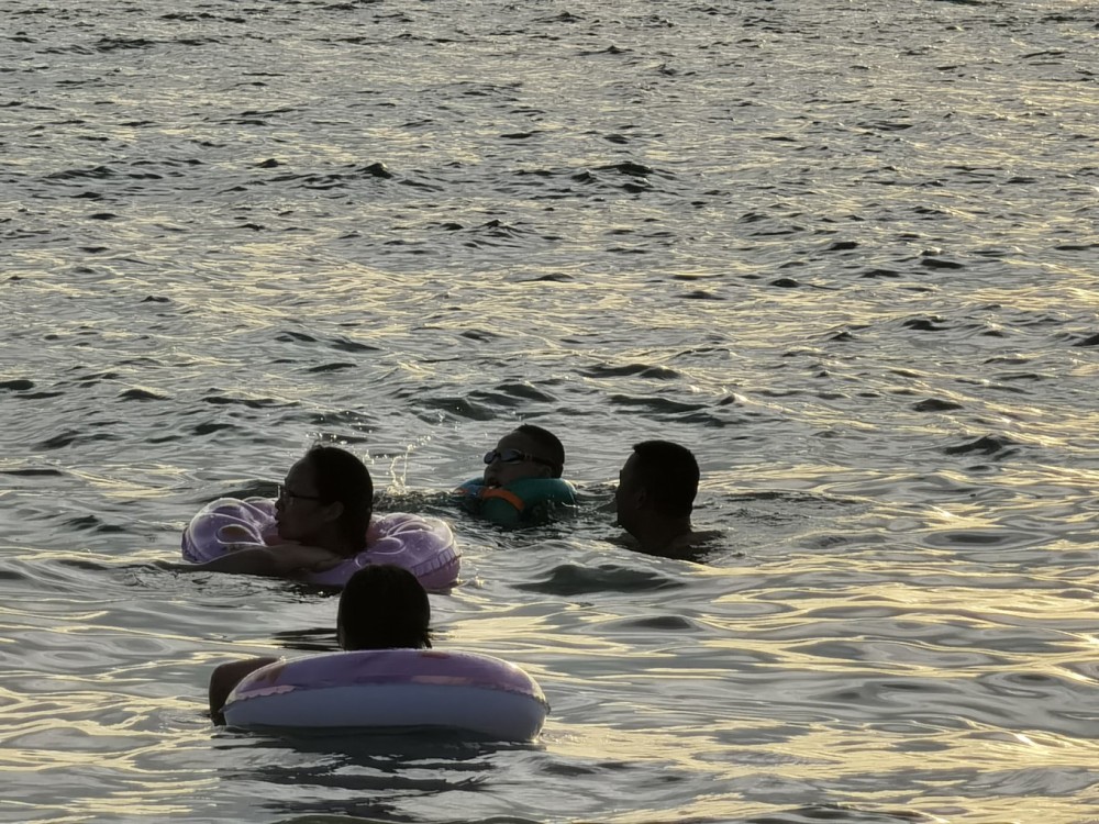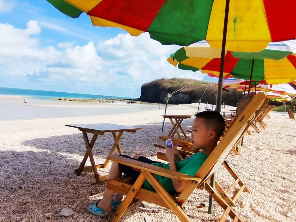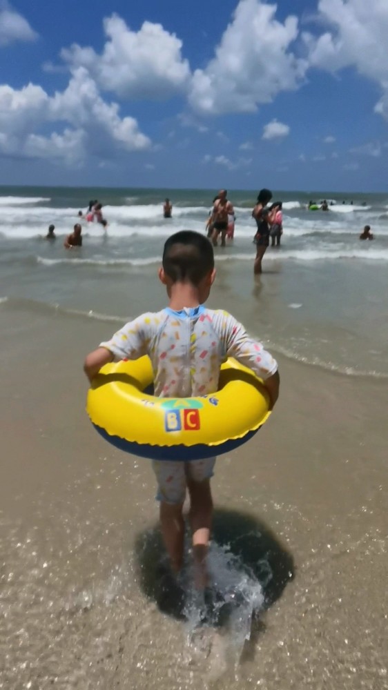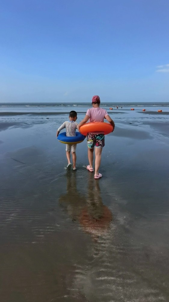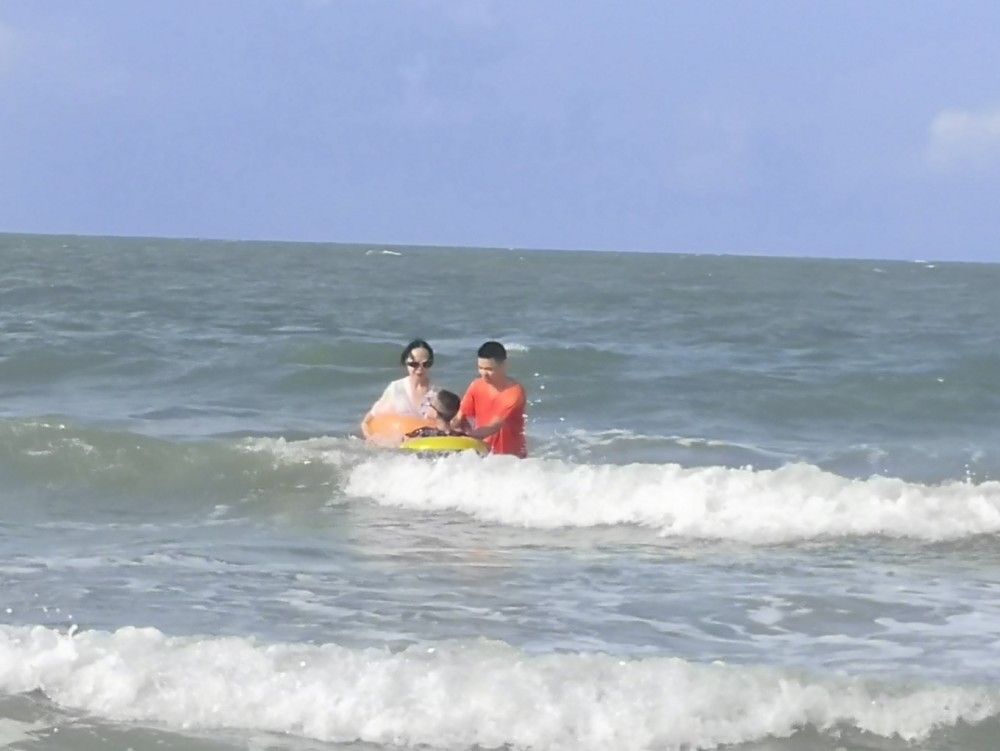 在涠洲岛傍晚游泳时,熊孩子把游泳眼镜丢到海里找不回来了,上午银滩游泳就没有眼镜保护了,但他还是玩得很嗨皮。