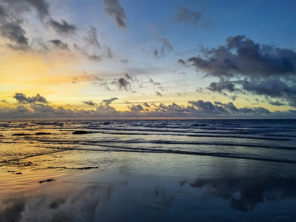 18:20,石螺口海滩上,美轮美奂的火烧云,让我差点忘记架起三脚架拍视频。注意哈,敲重点了,只有30分钟左右的日落美景黄金时间,迟了就只能拍日落后的蓝调时刻了。