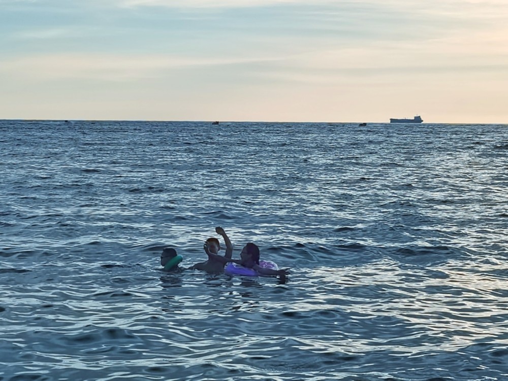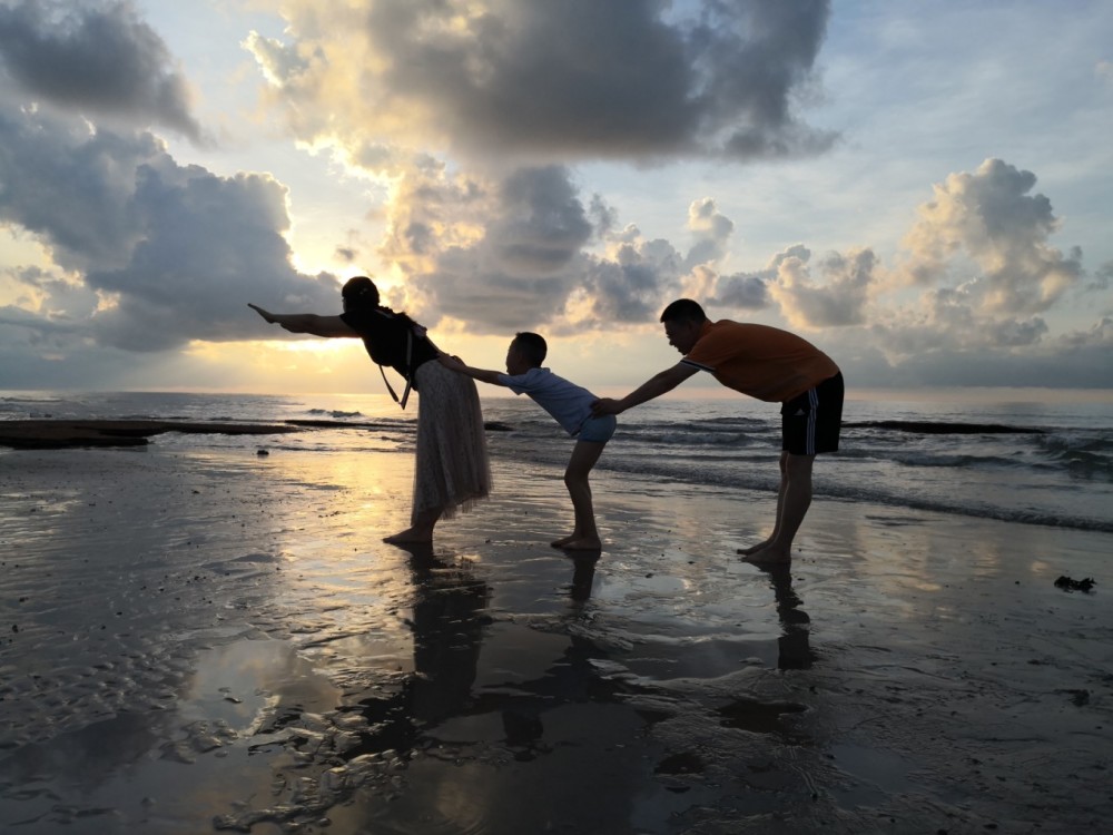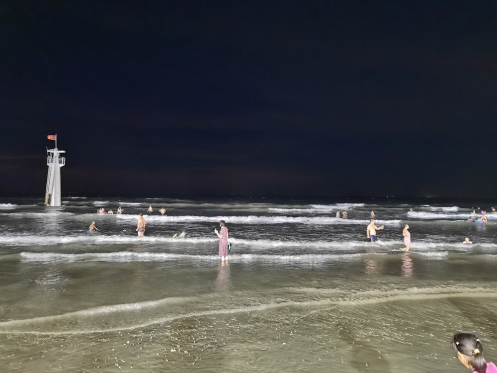 下午回到北海市区,傍晚去北海银滩游泳,强烈推荐,银滩才是带娃戏水玩沙的第一选择,沙滩上沙子细腻,赤脚踩上去很舒服,还是免费的。人多,但不算拥挤。浪比较大,引用我婆娘的话说的是,银滩的浪要大。