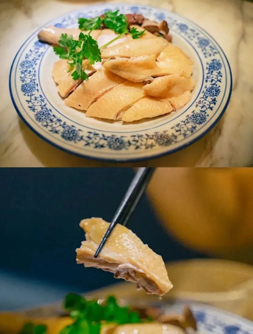 这是一种将调味降到最低的技法。表皮滑嫩爽口,没有多余的肥油脂肪,而鸡肉嫩滑一点都不柴,再裹上一层姜葱蒜油。