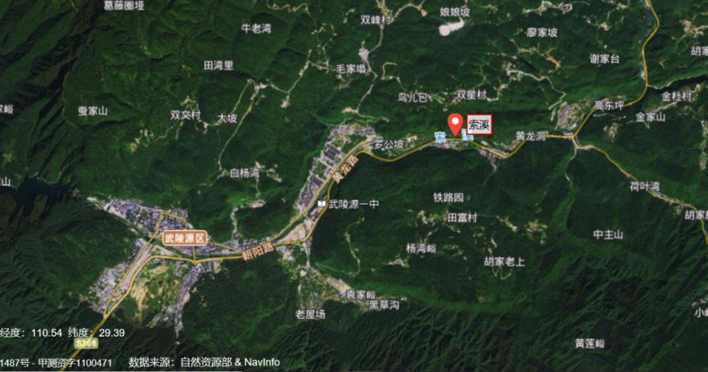 索溪峪自然保护区位于张家界国家森林公园东北方向,与天子山紧密相连,总面积约180平方千米。金鞭溪同南来的楠木溪、北来的矿洞溪三水相交向东汇成了索溪。索溪下游及全段又称“索水”,索水向东汇入娄水,娄水在慈利县城汇入湖南“四大水”之一的澧水,最后汇入长江,入海