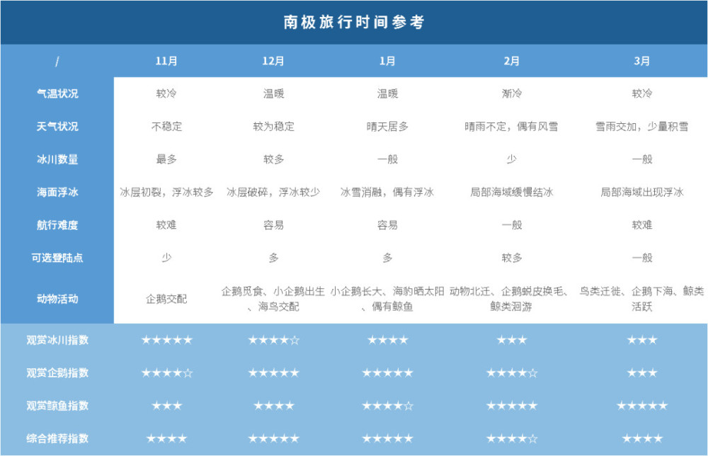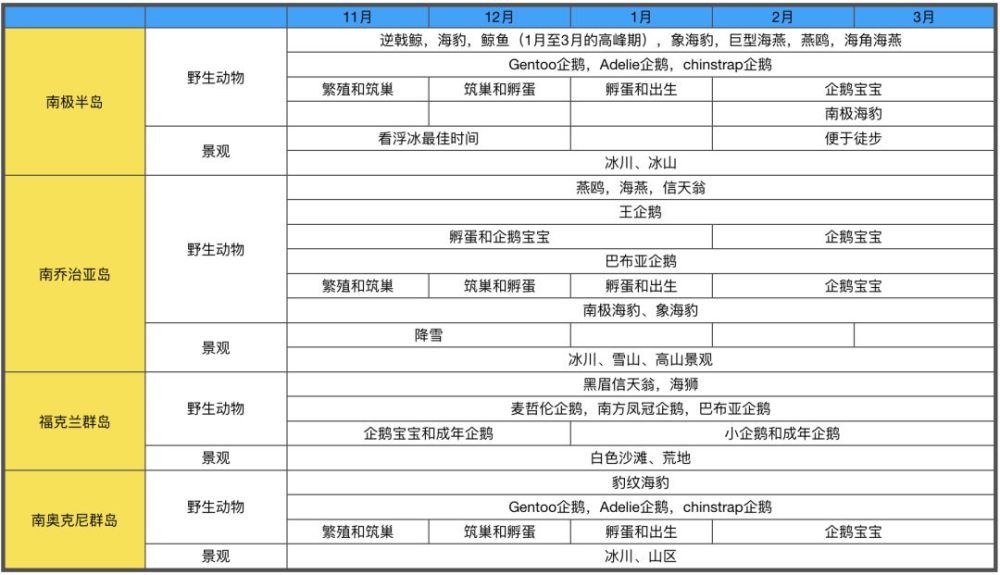 一张图,来说明一下南极邮轮的几个主流目的地,在11月至第二年3月,都可以看到什么吧。