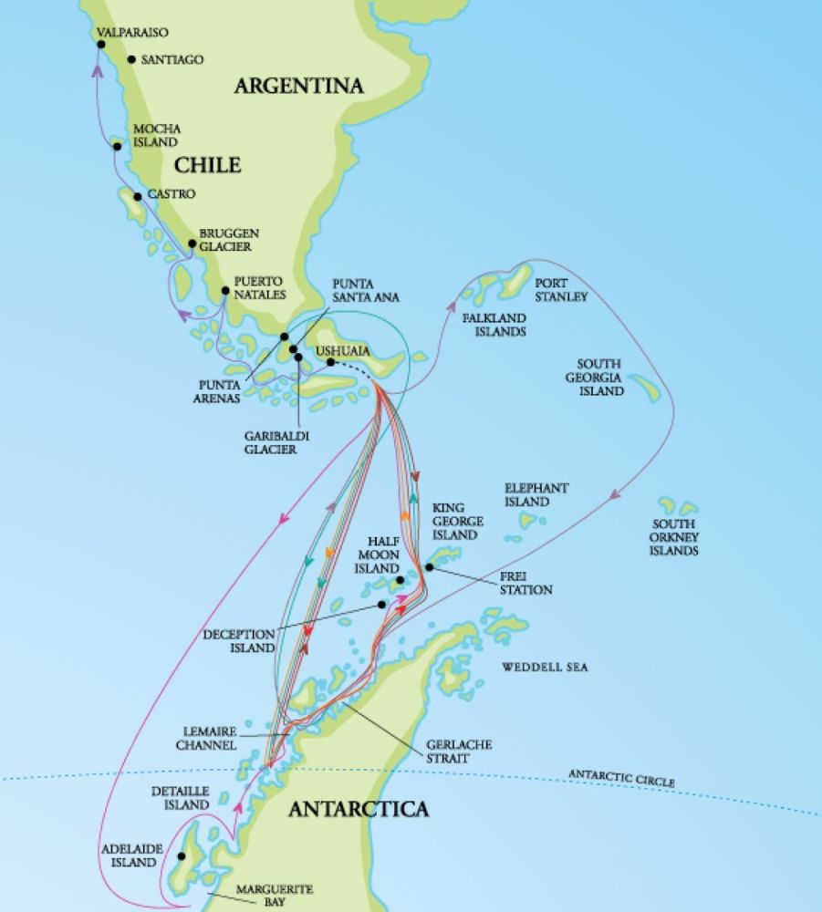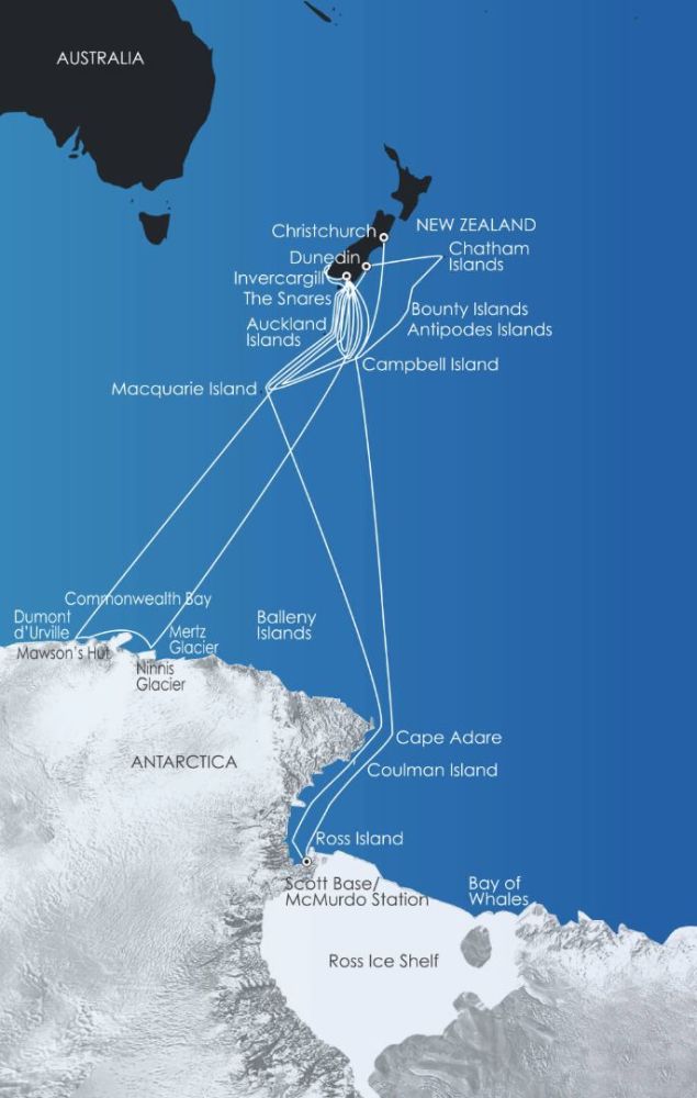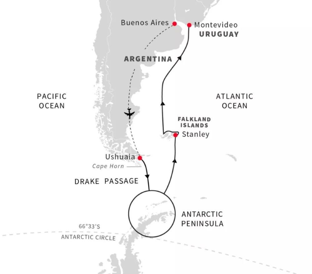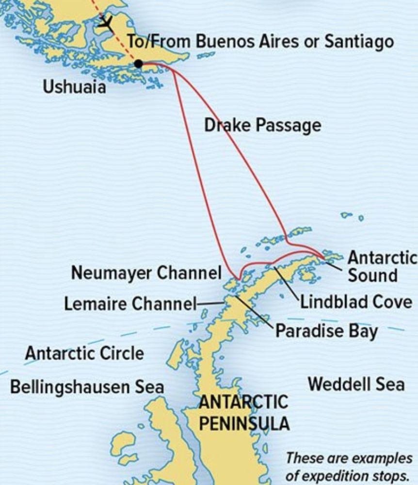 Lindblad的探险为主,所以在线路上往往会比其它家的南极邮轮玩的更加深入一些。例如下面的这条线路,从乌斯怀亚出发到南极半岛,再深入南极腹地,最终到达澳洲。