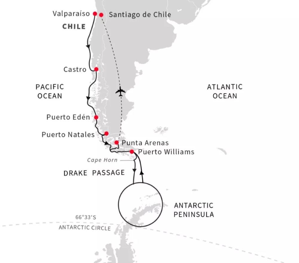 部分从智利圣地亚哥启程去南极的转港航线,会路过巴塔哥尼亚。