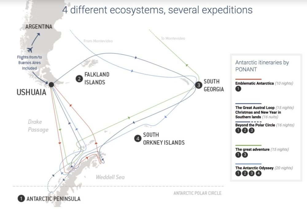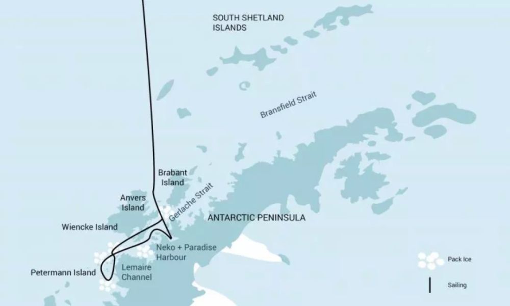 在南极邮轮的常规线路上,主要有南极半岛的、深入南极半岛进入到南极圈的(一般会多3天)还有去南极三岛(一般多9天)的。