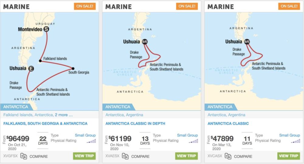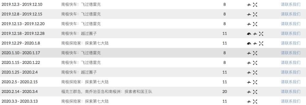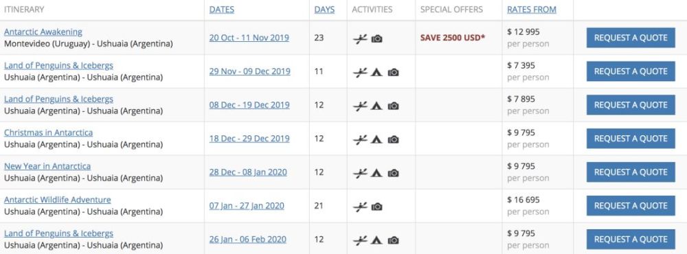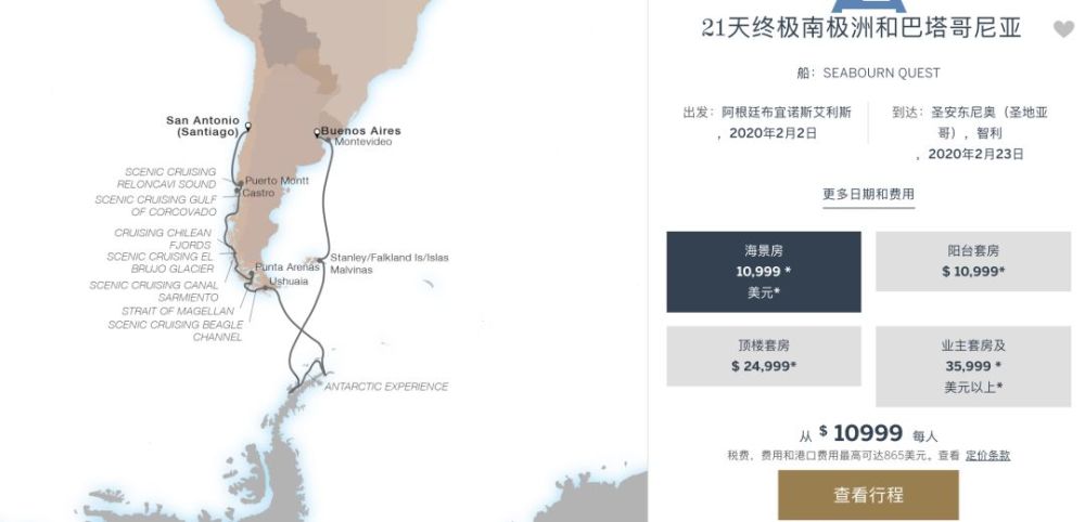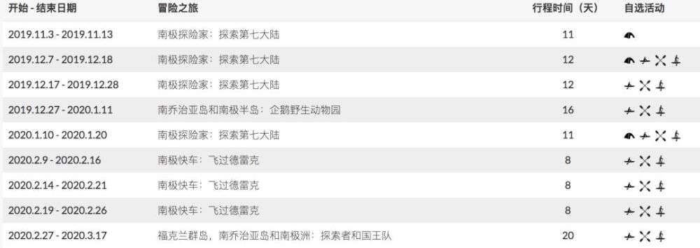 在过去的12年中,一直运营乌斯怀亚往返南极的航线,下图是19-20航期的线路,最低价格才5,460美元,性价比还真的是挺高的。