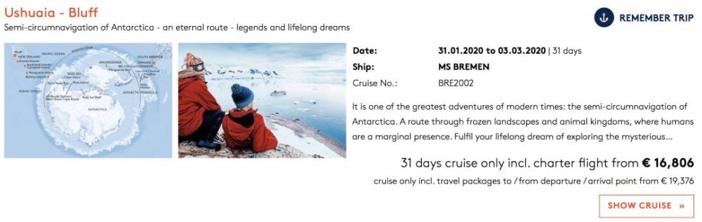 例如MS BREMEN号,31天绕南极半圈的行程。从乌斯怀亚开始,穿越德雷克海峡,到南设得兰群岛和南极半岛,再穿过Bellingshausen Sea,Amundsen Sea和Ross Sea到达罗斯岛,最终到达新西兰的布拉夫。