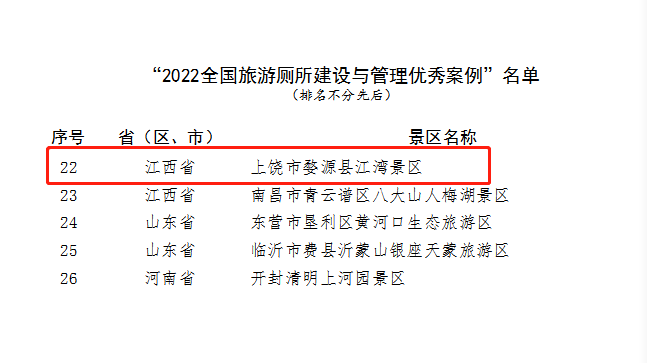 8.江湾景区入选2022全国旅游厕所建设与管理优秀案例。