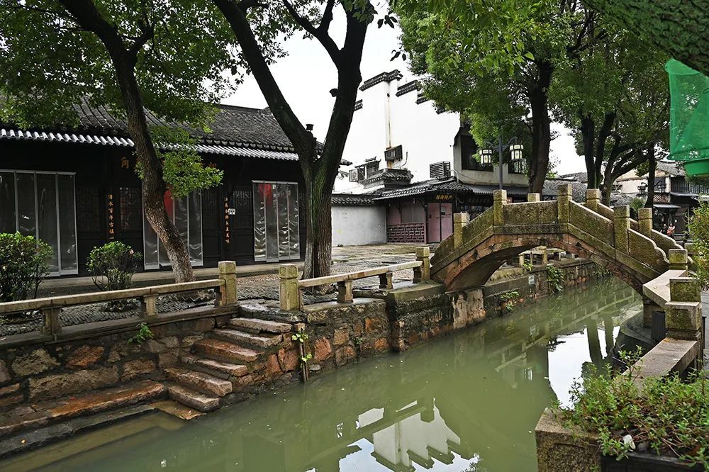 在甪直古镇中,主要的沿河街道是两竖一横的形状,在两河交汇处,往往有两座小石桥,俗称“双桥”,三步两桥就是三步可以跨两座桥的意思。湿漉漉的青石板街巷沿河而行,两侧的民居或面水而开、或临窗望水,每隔一段就有一座造型各异的小桥把街道连接起来,繁华和悠闲就交织在这水乡古镇的空气中,没有车来车往,进入古镇,就像走进水墨画中,就是有再着急的事情,也不忍去破坏这种氛围。
