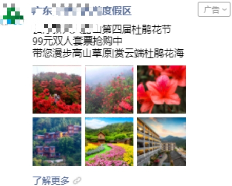 配图方面:多配图,颜色协调搭配,尽可能呈现原生图,贴近实景,如真实的游客游玩图,以某主题为主等,从而刺激用户点击广告。色调最好切合景区主题及季节来调整,如春天百花开放,夏天热情秋日枫叶冬日赏梅等