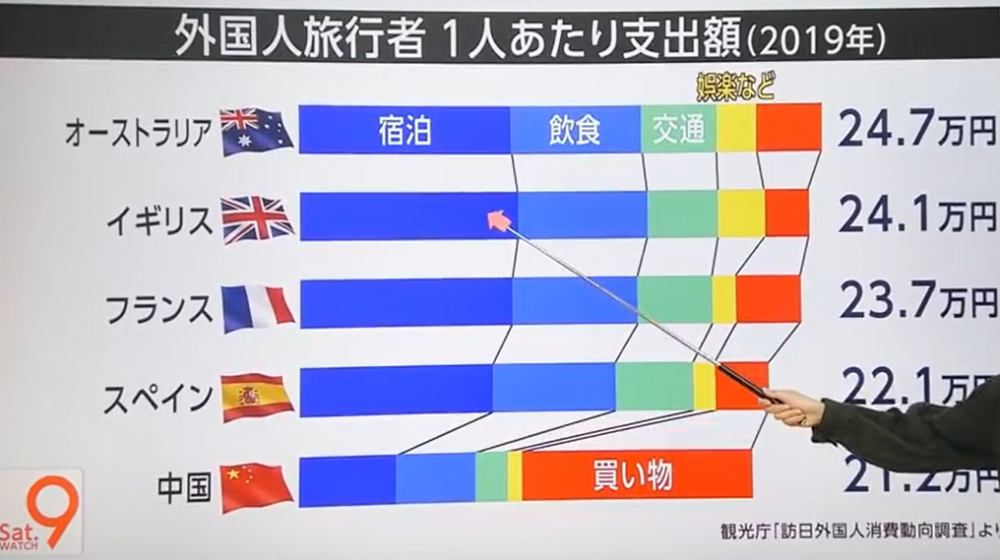 这是日本著名媒体“NHK电视台”的一个新闻画面:访日外国游客消费力前五名对比图(2019年)。