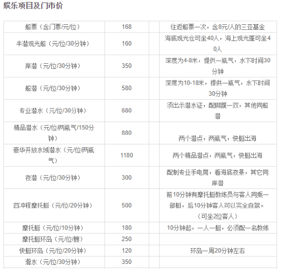 套餐包含潜水和海上娱乐项目,刺激性更强。套票包含蜈支洲岛门船票和午餐,有一站式快速上下岛服务项目有:飞艇自驾、普通环岛游、高级进阶潜水、海底漫步、高速摩托艇、3D技巧艇、动力滑板、海天飞舞、动感飞艇、大飞鱼、小飞鱼、香蕉船、滑水、帆船、彩虹拖伞、水上浮毯、海棠游、动感潜艇。