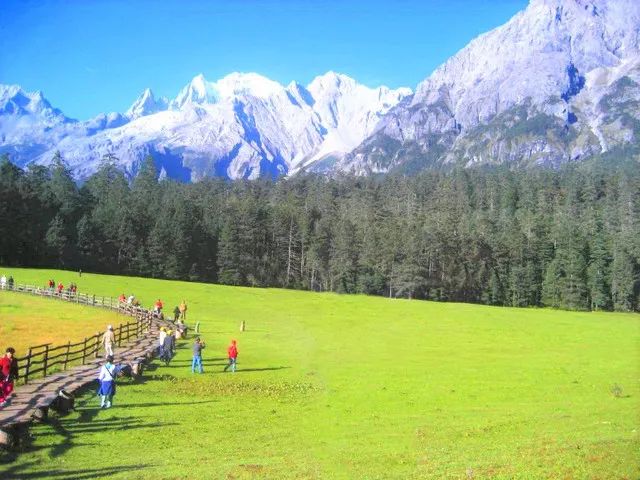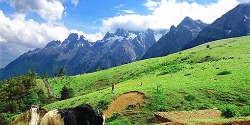 牦牛坪,纳西语称“般弄国”意为 “美丽神秘的天堂 ”。在海拔3800米左右,是一块面积为16.6平方公里的天然草甸,因盛产雪域高原牦牛而得名——牦牛坪。在牦牛坪索道站乘坐索道(牦牛坪索道也叫中索道)到达上部站牦牛坪,这里四季景色各异:春秋时节繁花似锦、遍地斑斓;夏天绿草如茵、牦牛成群;冬日银装素裹,尽显高山雪原的妖娆。在牦牛坪上观玉龙十三峰,峰峰终年披云戴雪,犹如一条凌空飞舞的玉龙伴您翱翔。蓝天下,雪山像晶莹剔透的玉龙,遥对着哈巴雪山,远处藏族姑娘的歌声衬着古朴的木楞房、玛尼堆,神秘而又浪漫。由于疫情影响,牦牛坪索道今年已经关停,恢复时间待通知。