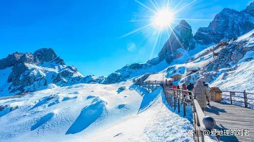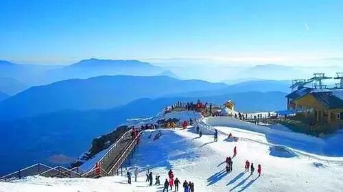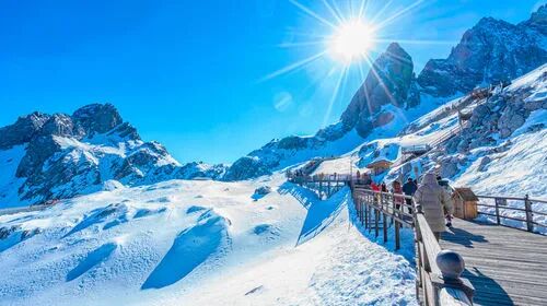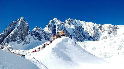 玉龙雪山纳西人心中的神山,主峰扇子陡海拔5596米,常年在云雾缠绕之中,是一座曾未被征服的处女峰。冰川公园处于玉龙雪山主峰扇子陡东北坡,是玉龙雪山现代冰川的典型代表。乘坐全封闭冰川大索道,你可尽览雪山无限风光,从海拔3000米的草甸出发,穿越高大挺拔的各种松林杉树,随索道上升,森林渐渐远去,继而灌木丛生,到海拔4000米以上则只能见到附着在山岩上的苔藓植物,最后就是茫茫白雪。到了索道上部站,走出索道站的站房,就步入了玉龙雪山冰川公园。
