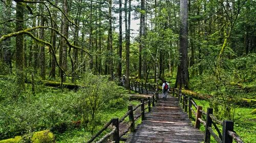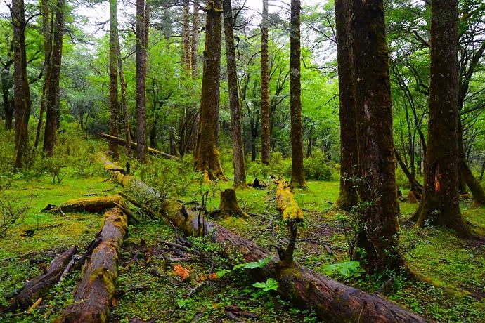 云杉坪是玉龙雪山景区里的一块幽静绿林,方圆约0.5平方公里。茂密的原始森林被苍茫的雪山环抱,像是一块巨大的绿翡翠镶嵌天地云雾间。漫步在云杉林间,在雪山背景的衬托下就像宫崎骏漫画里的后山小花园。随处可见倒地的腐木与枯枝,满地青苔。树荫下各色小花点缀其间,让人仿佛闯入到一处圣洁宁静的幽深之地。凡间的嘈杂,世事的喧嚣,通通在这里屏蔽。行走至甘海子牧场,举头望去,雪山云雾缭绕,如梦如幻。空山新雨后,深吸一口山间空气,顿时心脾贯通,神清气爽,真乃一片难得的人间仙界。这里也是拍婚纱照的热门景点。