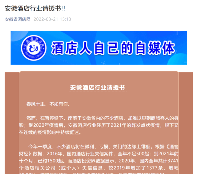 事实上,除苏州之外,各地酒旅行业都已主动发声求援。据不完全统计,上海麦淘亲子创始人谢震、山东酒店网、安徽酒店网、深圳市民宿协会、云南省旅游饭店业协会等都曾向社会发布过公开请援的内容。