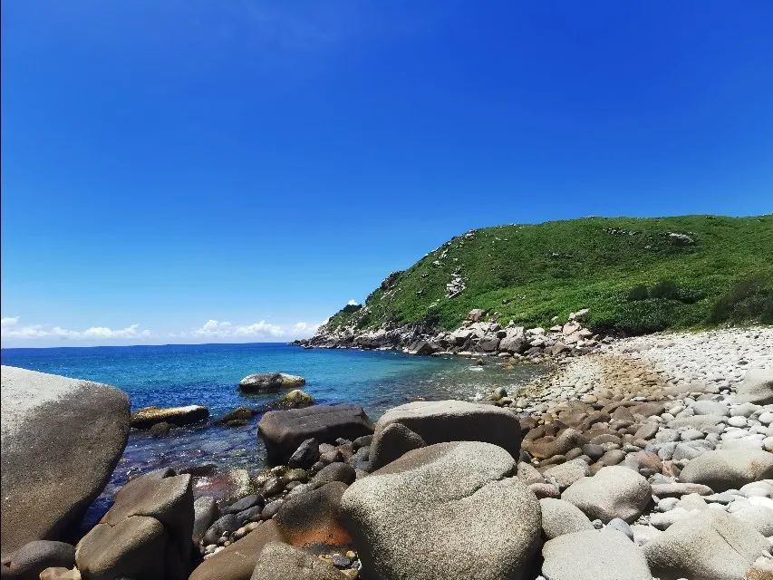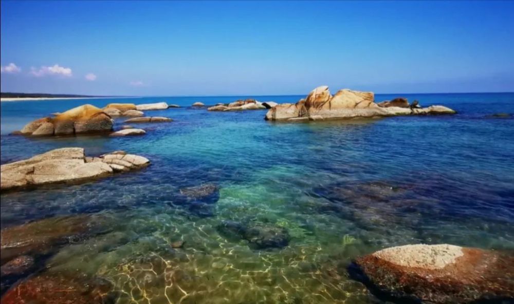 途中会经过乌场渔港,进门后左拐直行穿过村路到头的高台,下车后穿过草丛下到海边,有个台阶较高,杂草丛生,请注意行走安全。穿过草丛后眼前一幕出现了:在其他地方少有的巨石滩,周边分散着大大小小光滑的各色奇石,是目前海南非常难得一处多彩石滩,对面有个小岛叫做甘蔗岛。需要注意的是:这个地方没有开发,有时风高浪急,属于半军管区,不公开接待旅客,不建议过多人集体前往。