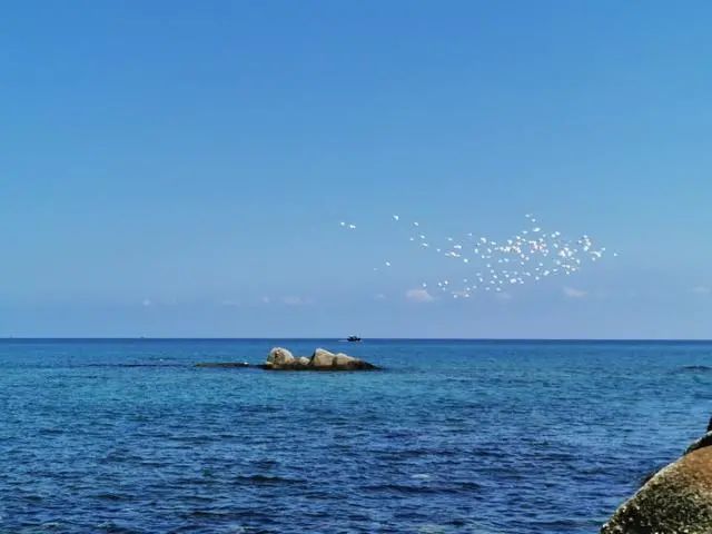 时而能见到成群的海鸟集体绕岸飞行,阳光、沙滩、海鸟、渔港共同组成一道靓丽的风景线。这里的港口是一级渔港,捕捞的水产在这里卸船装车运往各地销售。