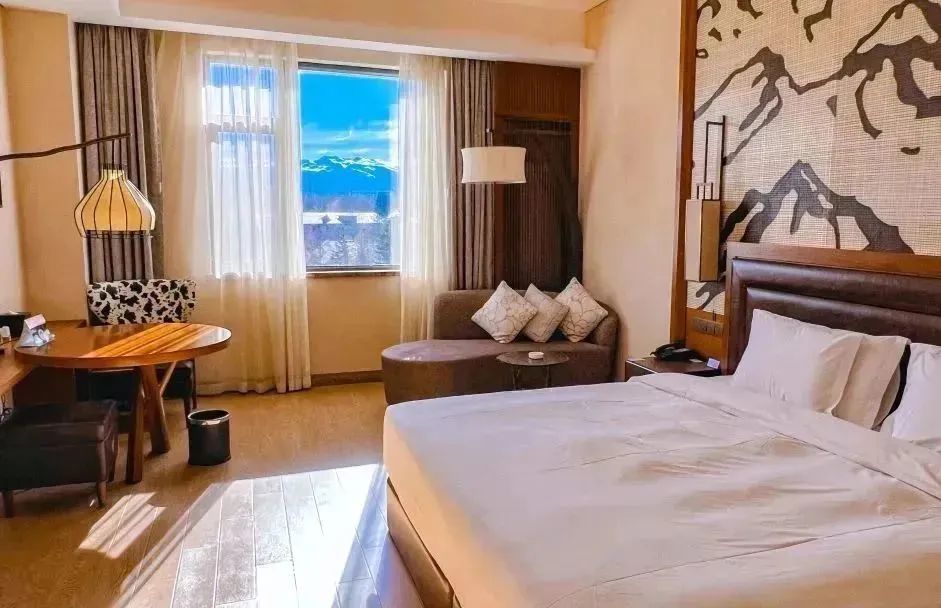 客房设施配备齐全,设计融汇长白山原生态和品牌现代气息,在山景房里躺着即可饱览长白雪山,悠闲惬意又浪漫。