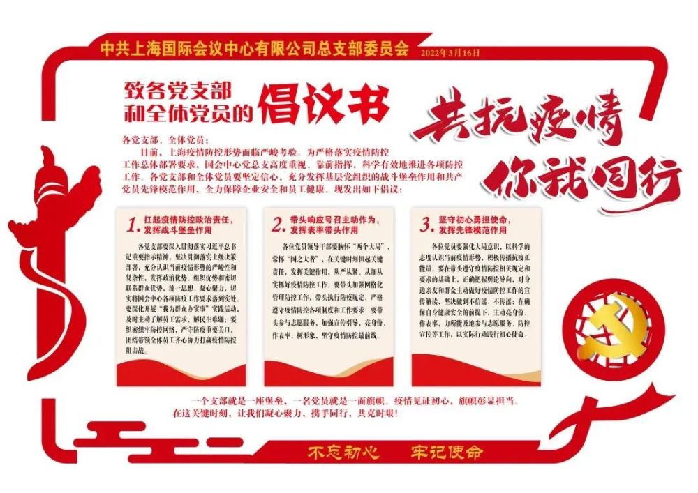国会中心党总支发出倡议书,鼓励各支部和全体党员要坚定信心,充分发挥基层党组织的战斗堡垒作用和党员先锋模范作用,全力保障企业安全和员工健康。