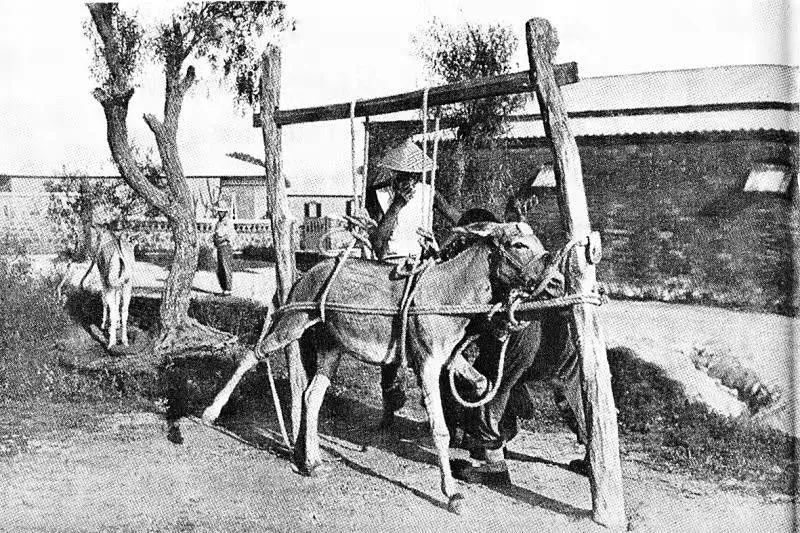 图为一头正在被钉蹄铁烦躁不安的驴子