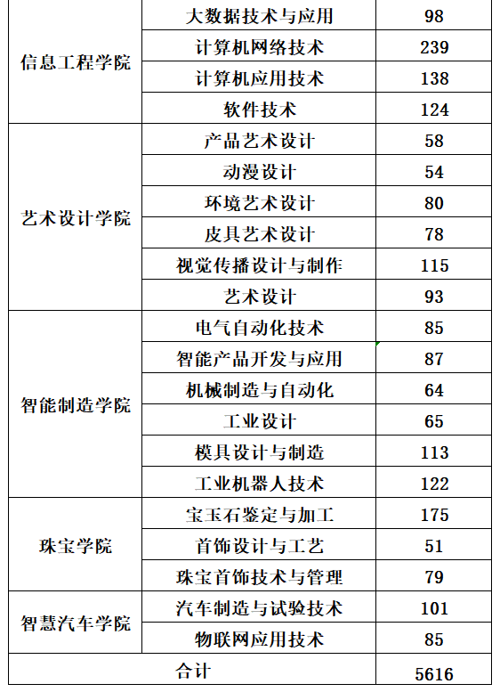 学校以高等职业技术教育为主,设有财经学院、现代物流学院、智能制造学院、建筑工程学院、信息工程学院、艺术设计学院、珠宝学院、旅游商务学院、智慧汽车学院9个学院,开设45个紧贴珠三角地区产业结构和社会发展需求的专业。目前,学校拥有艺术设计、珠宝首饰技术与管理等2个在建中国特色高水平专业群;拥有国家骨干专业10个、国家示范性高职院校重点专业6个、全国职业院校国家级示范专业点1个、中央财政支持提升专业服务产业发展能力专业2个、省级协同育人平台2个、省级示范性专业9个、省级重点建设专业8个、省级品牌建设专业16个。
