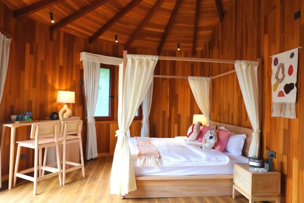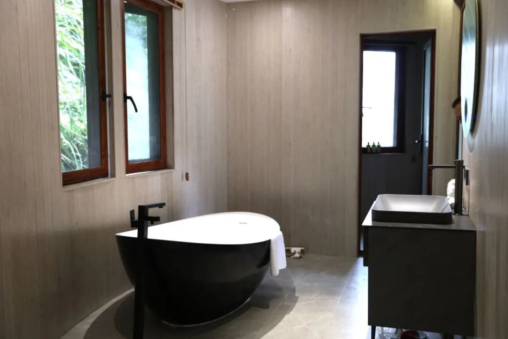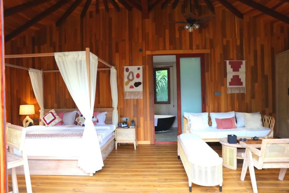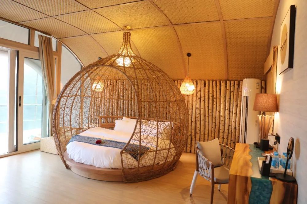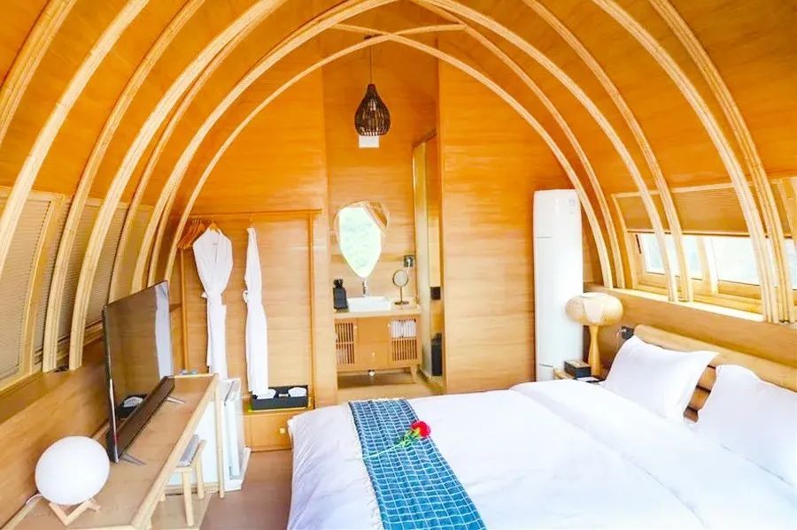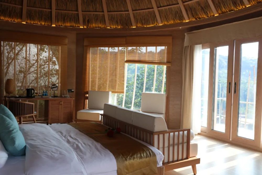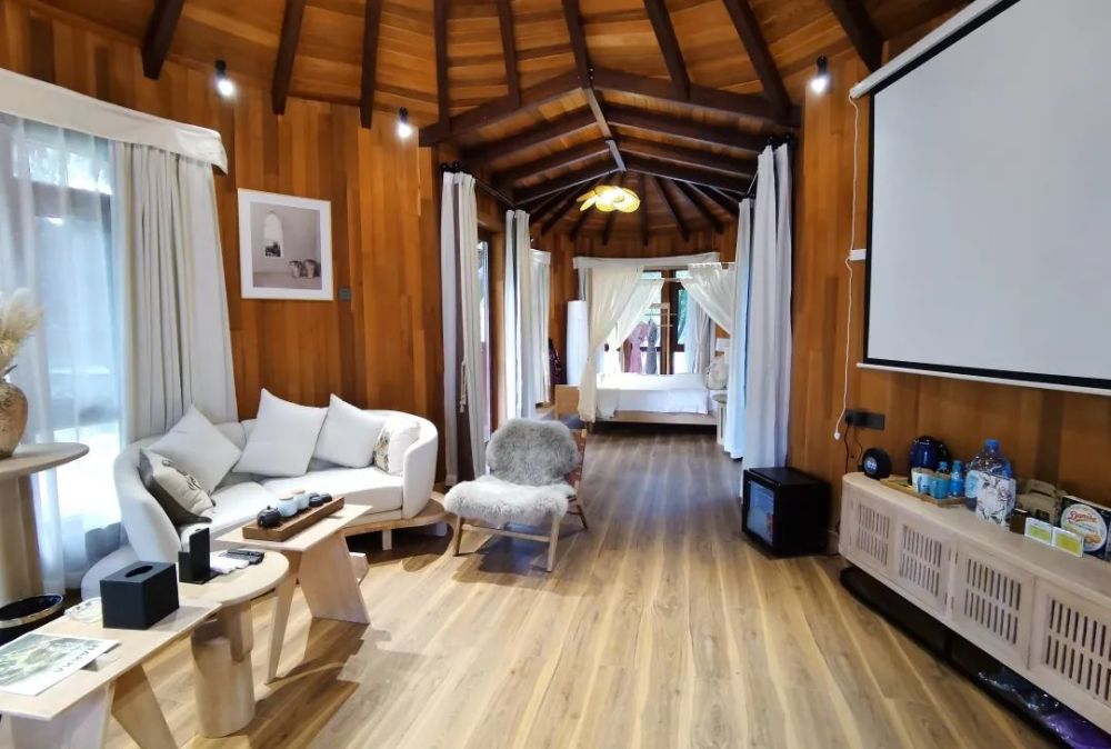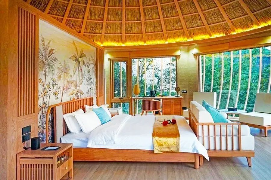 360°全景视野,不仅让你时刻被美景陶醉,也让内部格外明亮。各个功能区均由屏风、原木家俬隔开,床品、卫浴、马桶、灯具……你想要的舒适与情调这里都可以都有准备。