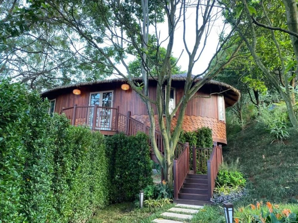 这里位于最高海拔666米的群山之中,远看就像把帐篷木屋挂在树丛里。