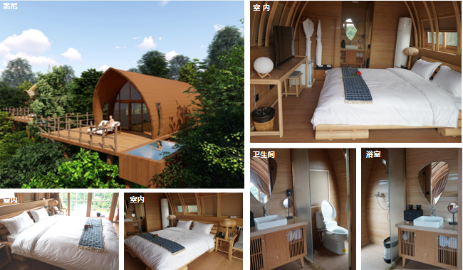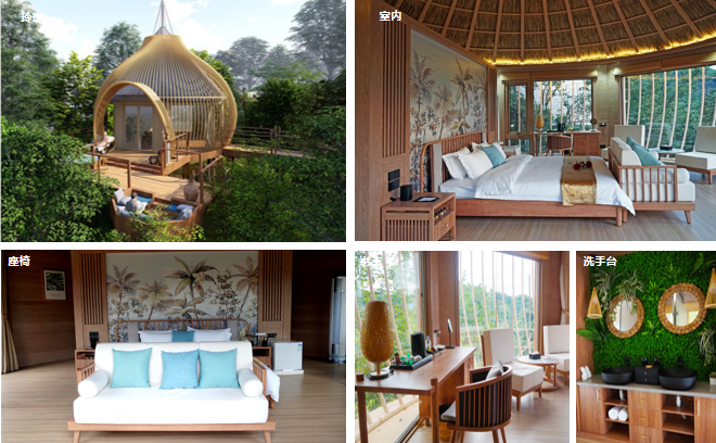 3幢不同主题的鸟巢树屋依山傍树而建,鸟巢树屋的建筑风貌与秀水青山交相辉映。踩着林荫间的楼梯抬阶而上,3幢树屋高低错落有致,设有归巢主题、玲珑主题、悉尼之恋主题户型。