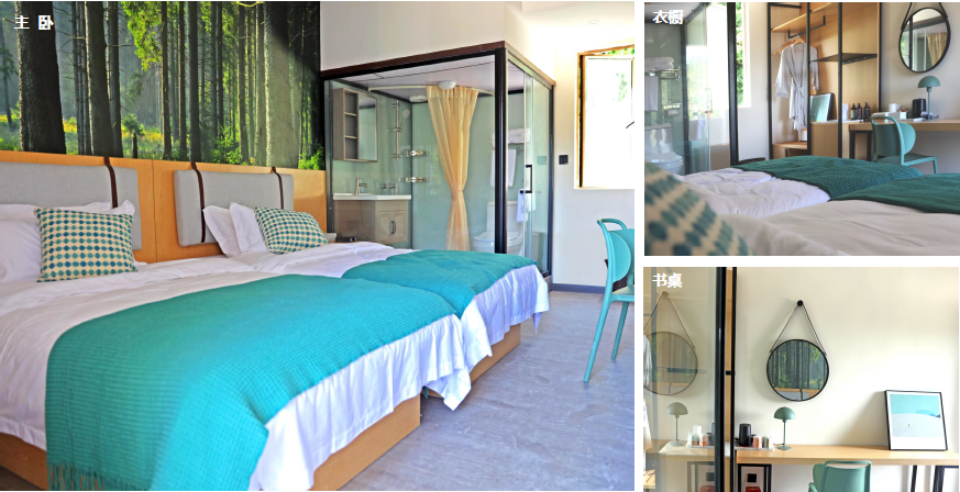 森林健康木舍位于项目停车场,交通便利,共有25间客房,分为大床房、双床房和三床房。室内装修以年轻人喜欢的蓝白清爽色调为主,简单明亮,充满时代感。