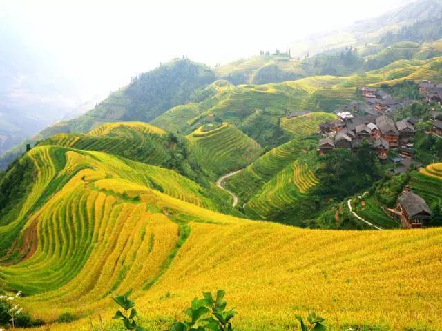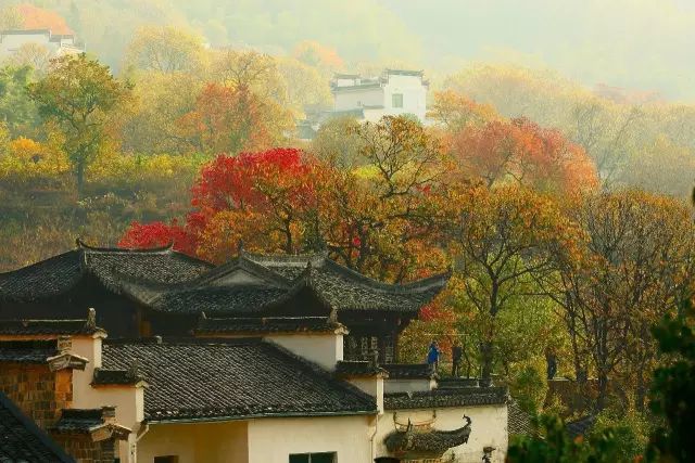 待到秋风拂过,漫山遍野的乌桕树呈现绿、黄、红的斑斓色彩,田地里白墙黑瓦的小村升起袅袅炊烟,景色如油画般优美。