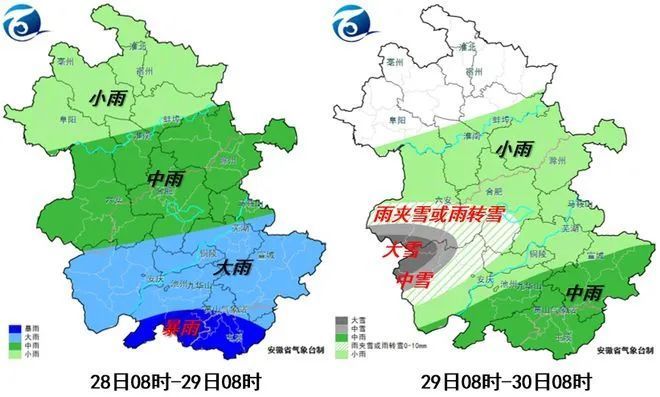 28 日沿淮淮河以南有中雨,部分地区大雨,局部暴雨。28-30 日我省自北向南将出现强寒潮天气,最低气温将下降 13~16℃,并伴有 7~8 级阵风;29 日-12 月 1 日大别山区和沿江江南部分地区将出现雨雪天气;30 日-12 月 1 日皖南山区局部有冻雨。