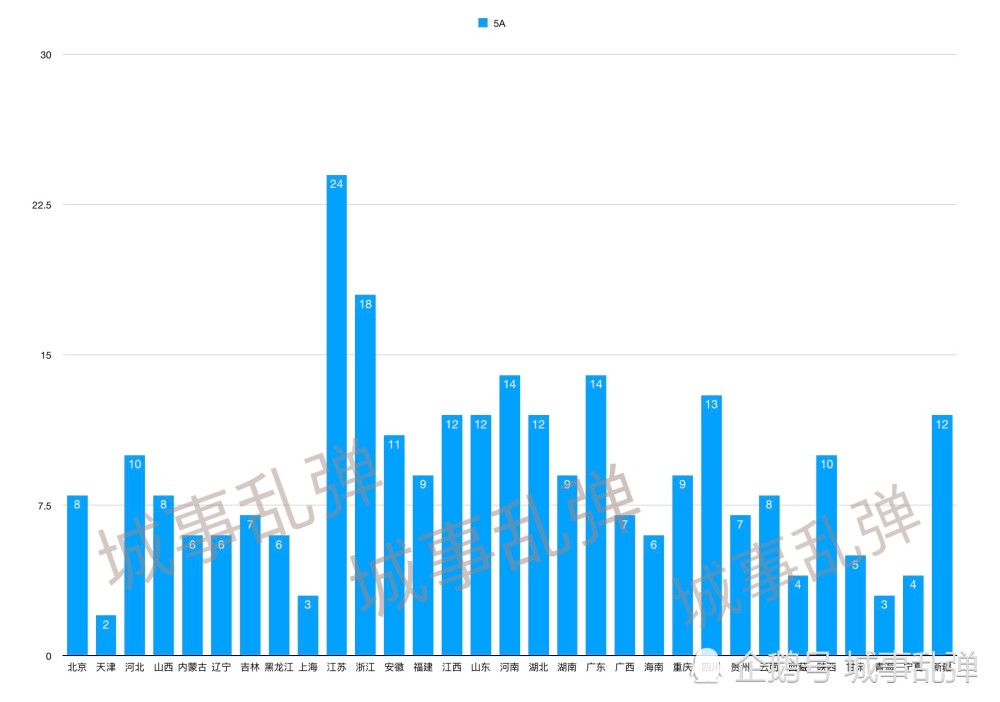 根据文化旅游部的数据,全国的5A景区有279家。5A景区最多的是江苏,达到了24家,排在其后则是浙江和广东,前者18家,后者14家。5A景区少于5家有四个省市,上海、青海、宁夏、西藏。上海只有3家5A级景区有些意外。