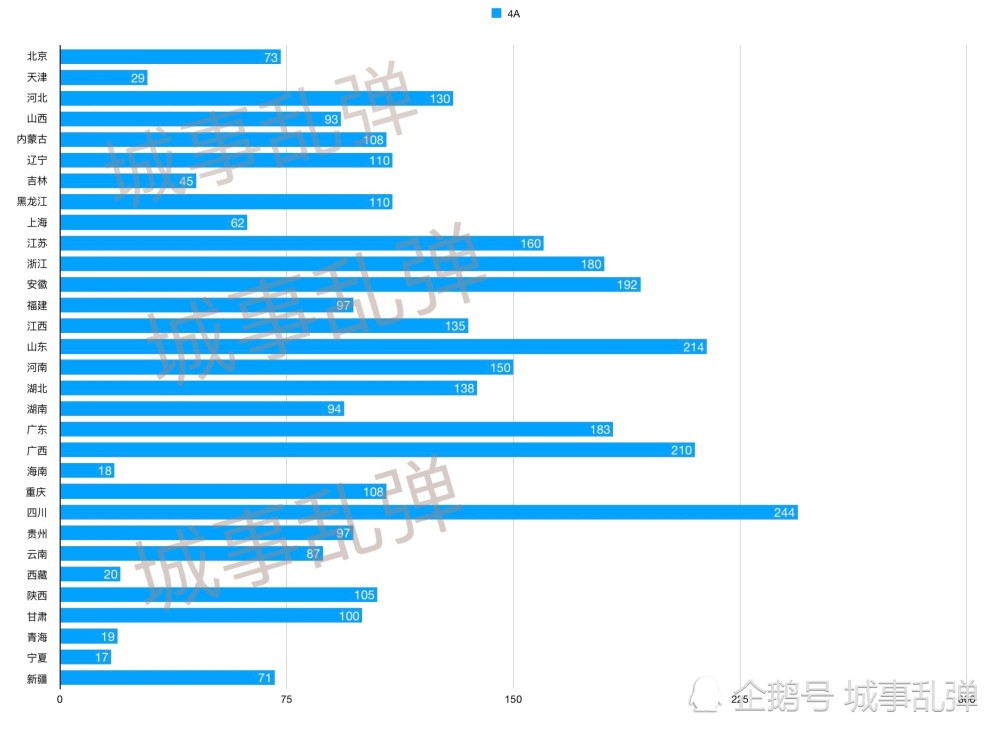 5A级景区包含森林景观、地质遗址、文博院馆、宗教古镇等不少品类,不过作为文旅部核定的景区,评选非常严格。全国4A级景区根据maigoo不完全统计达到了3399家。4A景区最多的则是四川,244家,超过200家的省份还有山东和广西分别是214家和210家,位列第二和第三。
