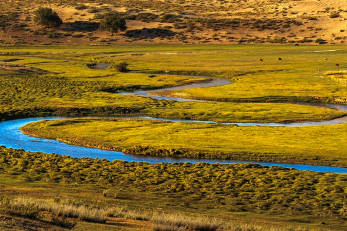 高格斯台河88公里旅游环线—由两条河流汇聚而成,贯穿2个苏木6个嘎查。夏天气候温润,凉爽宜人,远远望去碧水弯弯,在茫茫沙地和榆柳中时隐时现,葱郁的草木、连绵的沙丘、潺潺的流水、珍珠般散落的畜群,构成了这里独特的迷人风光。