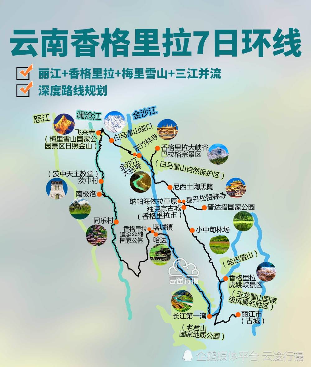 云南滇西北香格里拉+梅里雪山+云南三江并流保护区(金沙江、澜沧江、怒江)+丽江古城全景7日大环线旅游全攻略路线地图(原创)